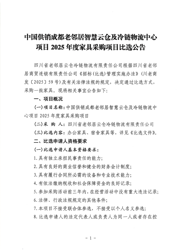 中國供銷成都老鄰居智慧云倉及冷鏈物流中心項目2025年度家具采購項目比選結果公示