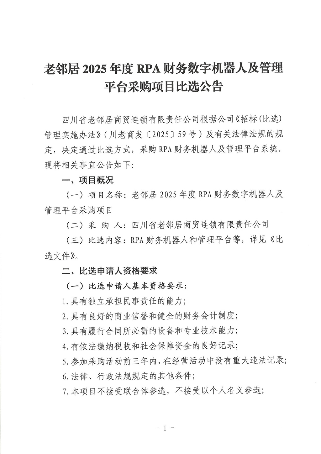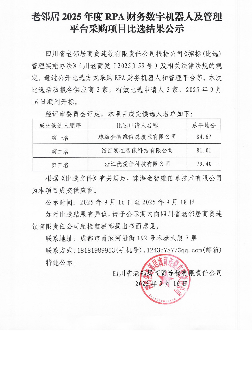 老鄰居2025年度RPA財務數字機器人及管理平臺采購項目比選結果公示